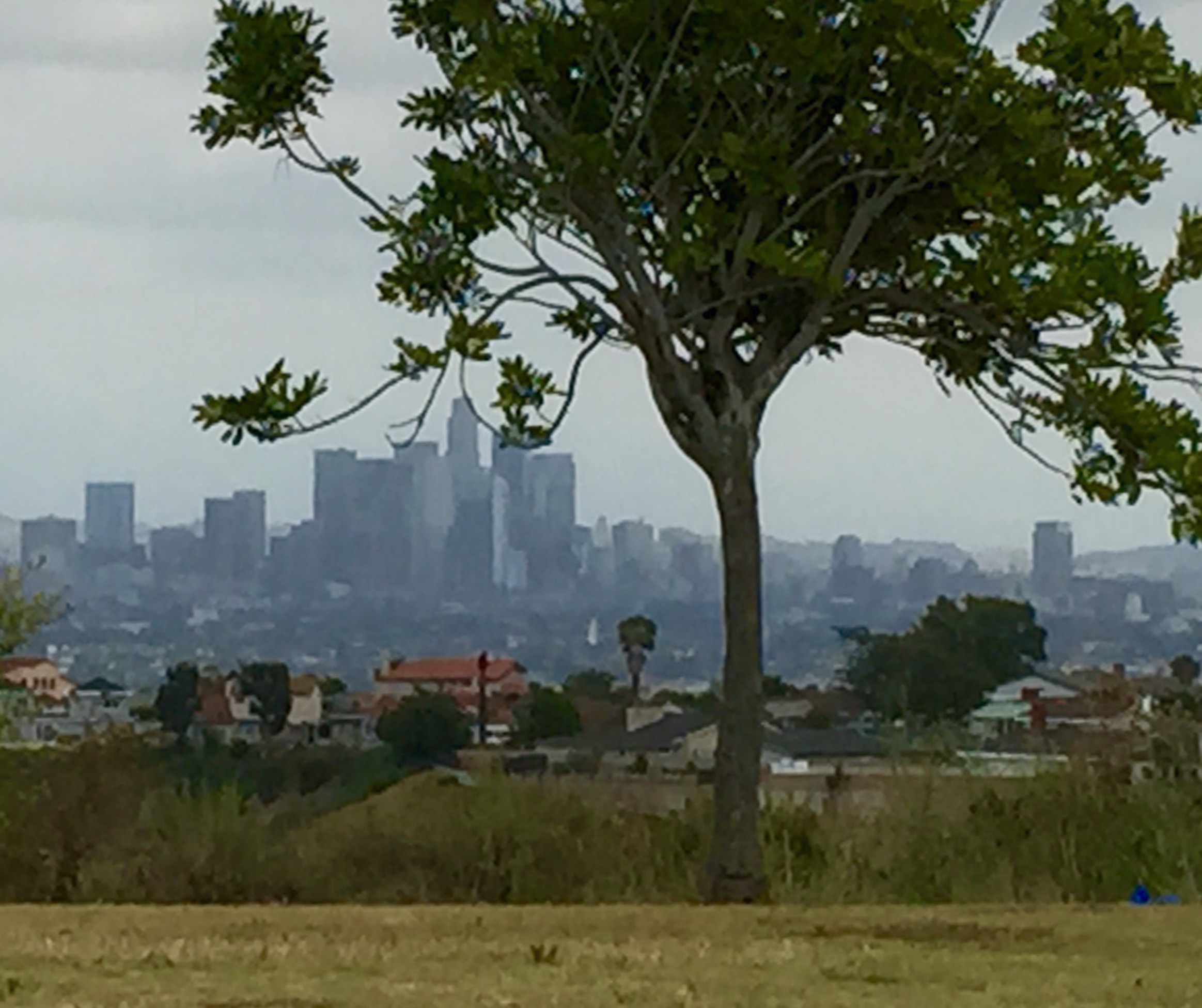 8. And the other photo, showing the L.A. high rises in the distance, was taken from the bench at the park mentioned above where the dogs and I decided to stop and read a while. 🙂 It was a cool day, one of our “Gray May” days, almost looked like it was going to rain at times but it never did.