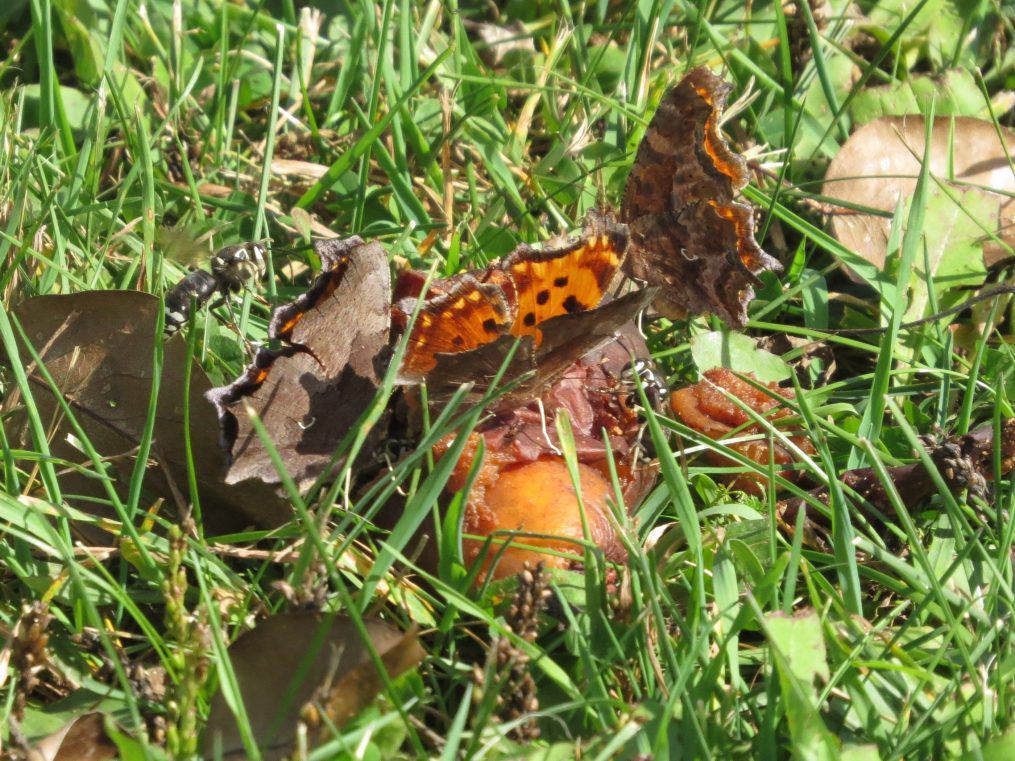 Sorry I didn’t get on here earlier–my husband and I went for a LONG walk this morning and afternoon. Not having slept much at all last night, I then had a nap. Anyway, one of you figured out this morning’s “Where’s Waldo” shot was butterflies–to be precise, eastern commas feasting on fallen pears. If you look at the outside of the wing, you see why it is called a comma. See the white comma? The outside of the wing blends in with dead leaves, the insides with autumn leaves. They overwinter (hibernate) as adults, so we see adults late in the fall and theoretically also early in spring, and also in summer. I’ve only seen them in fall, except once this summer I think. But this fall I was seeing as many as five or six on those pears (three in the first photo). And I thought the one on the side of the pear tree, with a few late asters blooming behind it, was a pretty autumn sight.