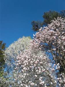 Good morning! The photo shows the Birthday Tree (not waiting for March 11th) along with our neighbor’s flowering pear tree, and her pine tree in the background trying to photo bomb.