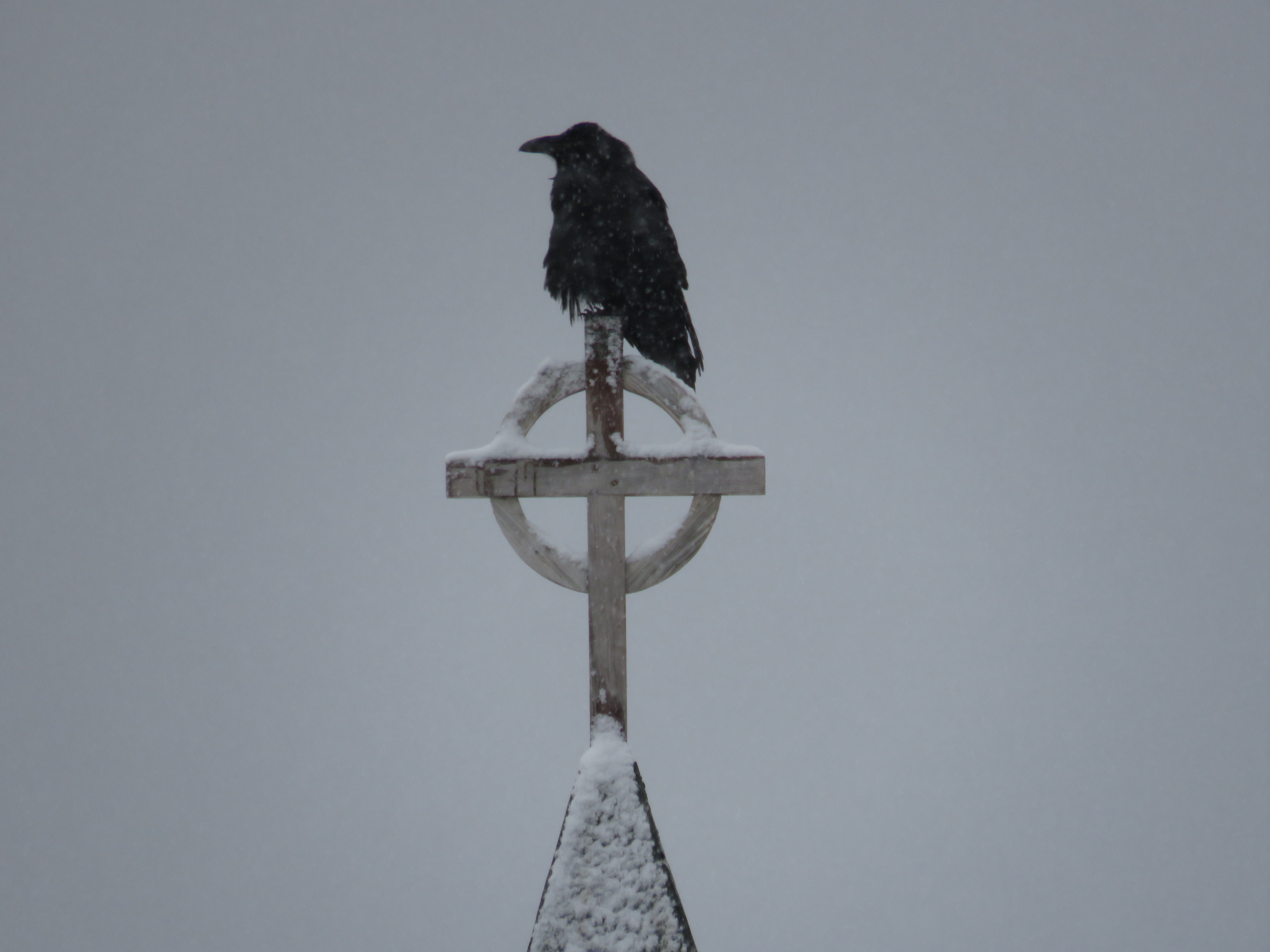 The cross is on the steeple of the old Anglican church – there is a new church building across the street. There are a number of buildings, right in the centre of the ‘downtown’ that are boarded up, all formerly owned and operated by the Anglican mission, including an old hospital and nursing residence. The ravens like to hang out there, like troubled youth, choosing the abandoned buildings to do their vandalism and waylay hapless rival gang members, in this case, the small dogs.