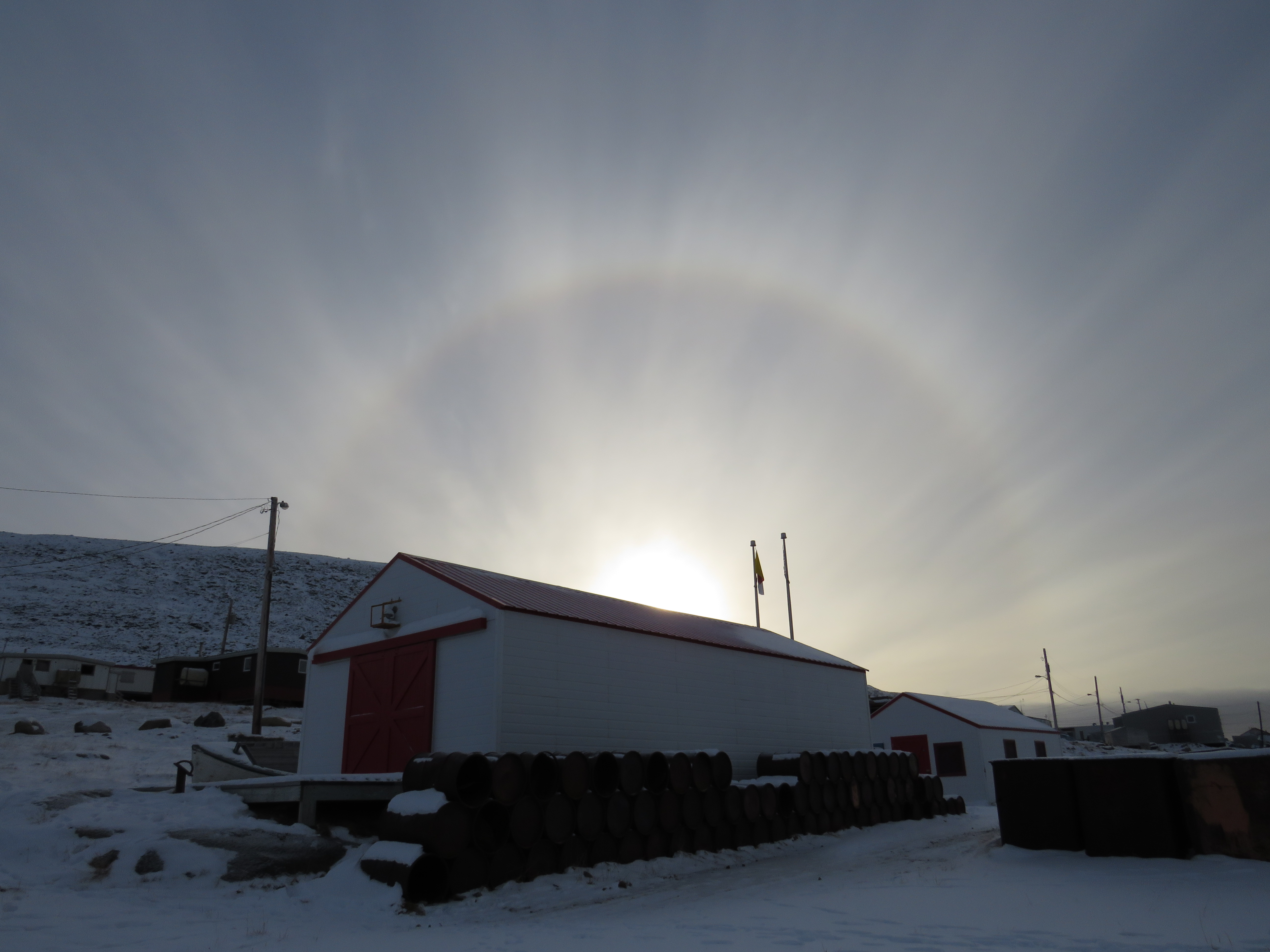 6, I took the picture almost exactly at 2:00 in the afternoon. The sun was just peeping over the edge of the mountain that overlooks the hamlet. We (my fellow student and I) had gone to get some packages that had come for us (I finally got the parka made in territory that I had ordered in the summer) when we noticed the sun halo. So, I had to get my camera and go out to take a few pictures of it. The buildings in the foreground are of a historical site right by the edge of the fjord, where the Hudson’s Bay Company collected blubber for whale oil, that is now a bit of a local museum. A sun halo is from the sunlight reflecting off ice crystals in the air. A full moon may also produce a halo – a couple of years ago, one February, I got a picture of a moon halo I saw at my parents’ place, and I saw one last year in the winter while I was walking home from an evening class (I didn’t have my camera with me then). It was quite brisk out there yesterday, but not any colder than a January day in southern Ontario.