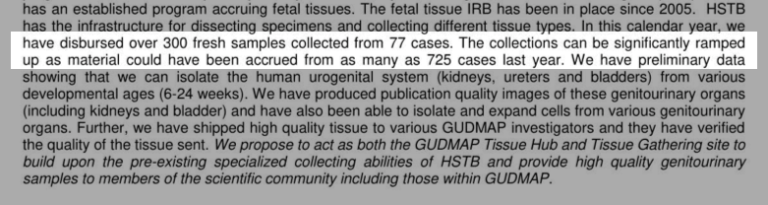 As just discovered this week, the specific terms of the grant were to “develop a pipeline to the acquisition, quality control and distribution” of human babies from all levels of development right up to the age of birth. The University of Pittsburgh’s grant application to the NIH requests funding to “generate an ongoing resource” to fetal tissue from babies 6 to 42 weeks old by establishing itself as the “Tissue Hub and Collection Site” for the “GUDMAP” project. The project supplies researchers across the country with aborted kidneys, bladders, and other organs for experimentation.